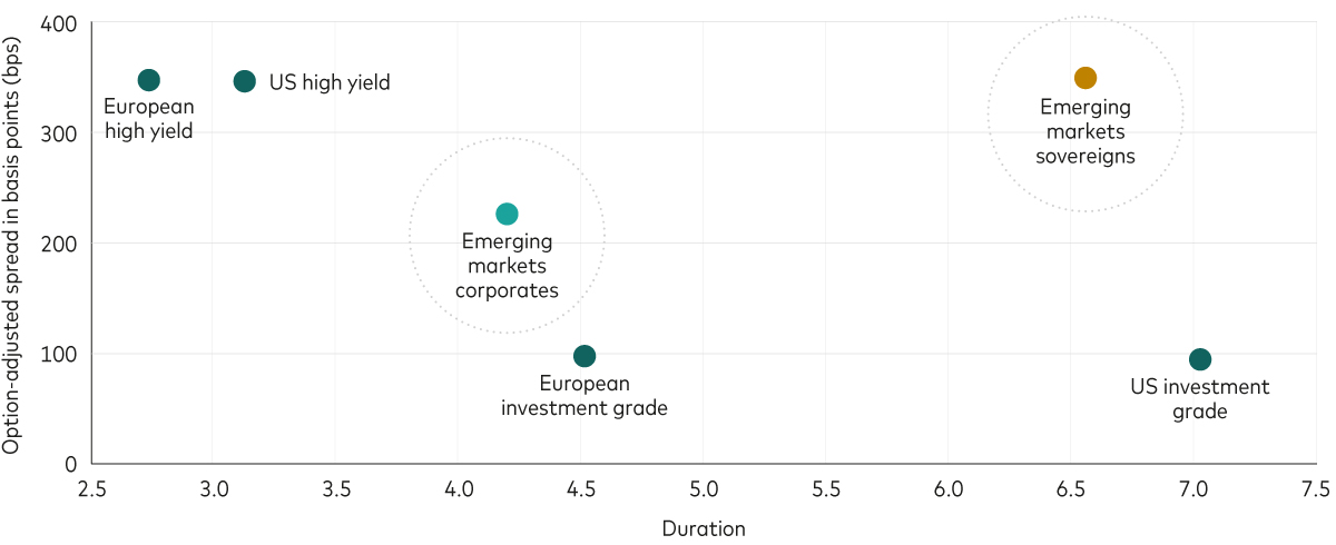 Source: Bloomberg, as at 19 March 2025. Indices used: US high yield: ICE BAML US High Yield Index; European high yield: ICE BAML European High Yield Index; European investment grade: Bloomberg Euro Aggregate Corporates Index in EUR; US investment grade: Bloomberg Global Aggregate Corporates US Dollar Index; EM hard currency sovereigns: J.P. Morgan EMBI Global Diversified Index; EM corporates: J.P. Morgan CEMBI Global Diversified Index.