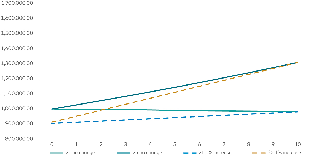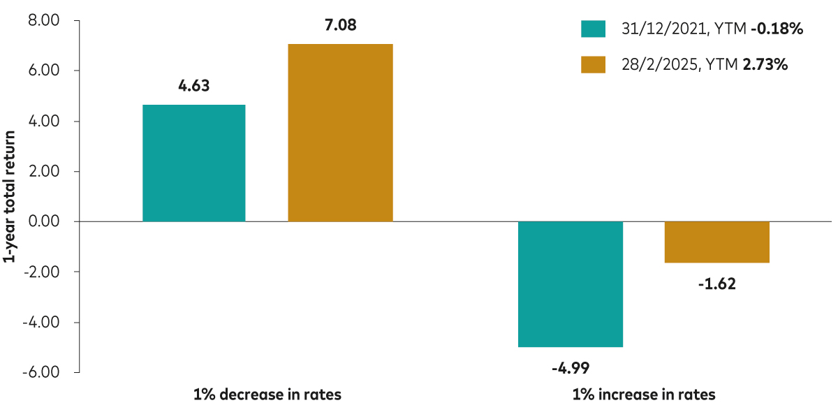 Notes: Modified duration calculated as at 31 December 2021 and 1 March 2025 using 10-year German bunds. Changes in rates assumed to impact the price of the bonds immediately and assumes that the change in rates is the same across the entire yield curve.